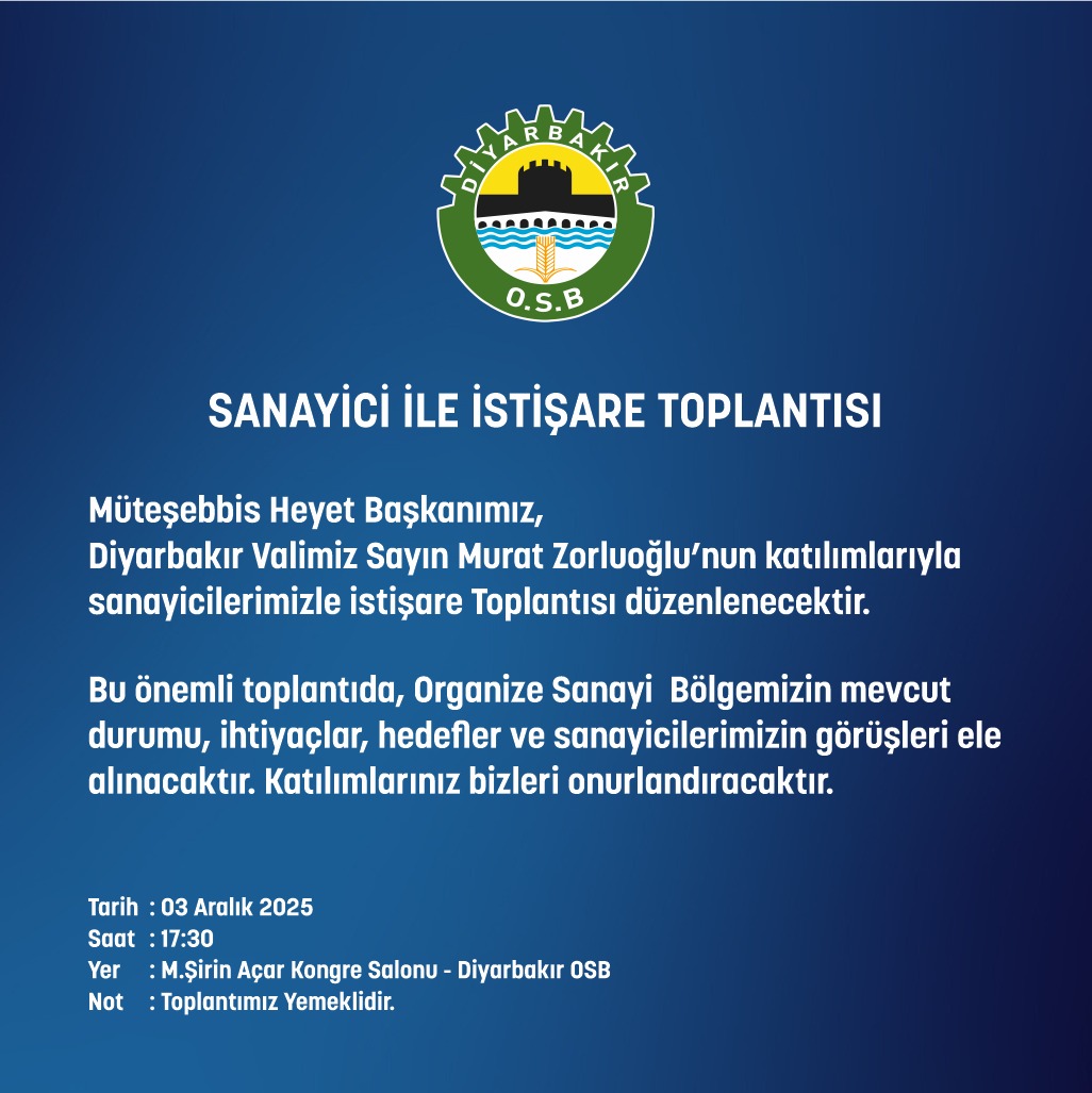 Diyarbakır Valimiz Sayın Murat Zorluoğlu’nun katılımlarıyla sanayicilerimiz ile İstişare Toplantısı düzenlenecektir.